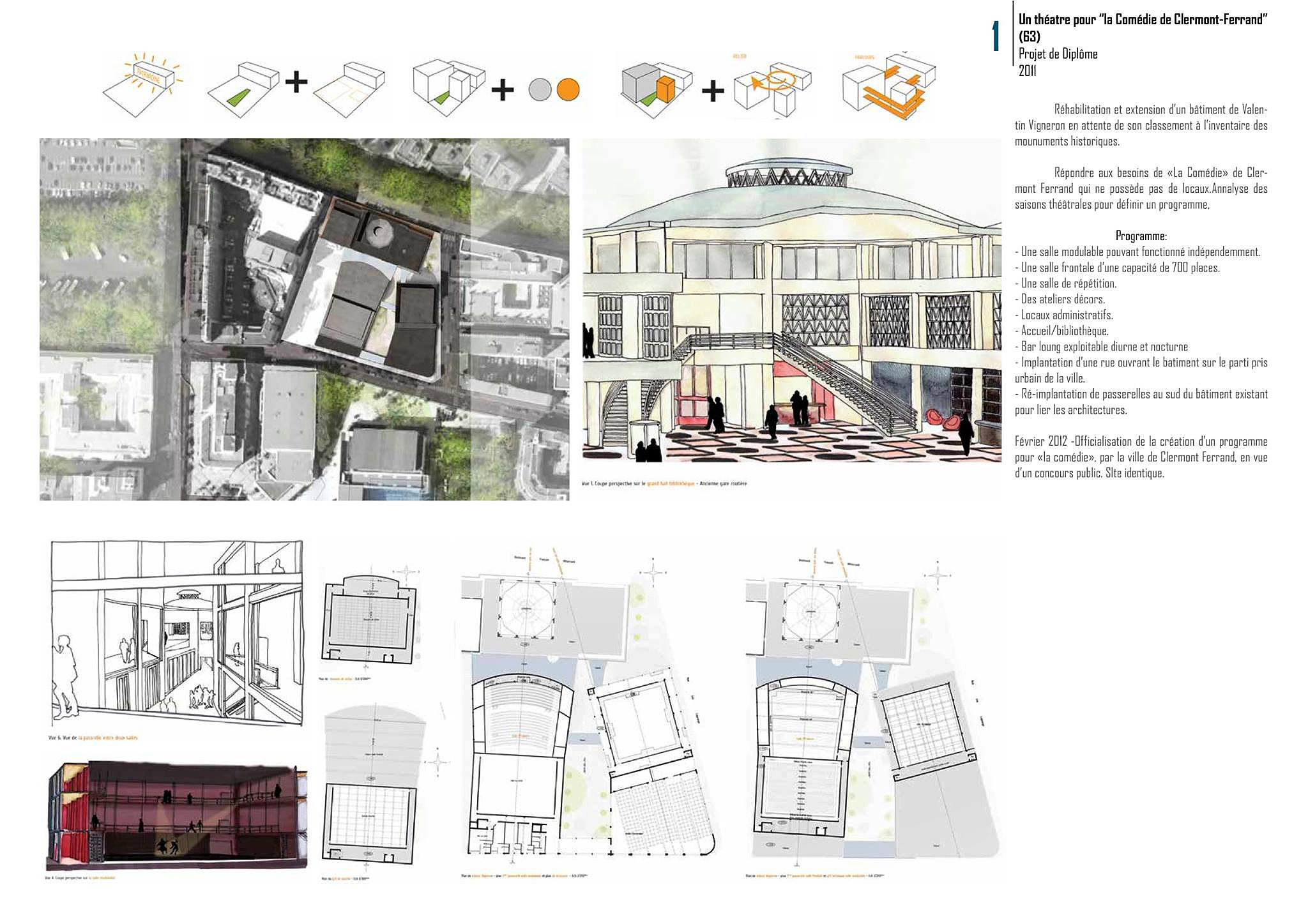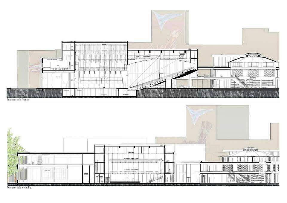 – Programme : 1 salle d’une jauge de 700 places – 1 salle modulable avec gradins télescopiques (les 2 salles pouvant fonctionner en même temps) – 1 atelier de décors – 1 salle de répétition – 1 espace administratif – 1 Espace loges – 1 régie fixe – 1 bar lounge pouvant fonctionner de façon diurne et nocturne – 1 hall d’accueil bibliothèque – implantation d’une voie verte traversante – reconstruction des auvents historiques et intégration de cette élément architectural historique dans le projet